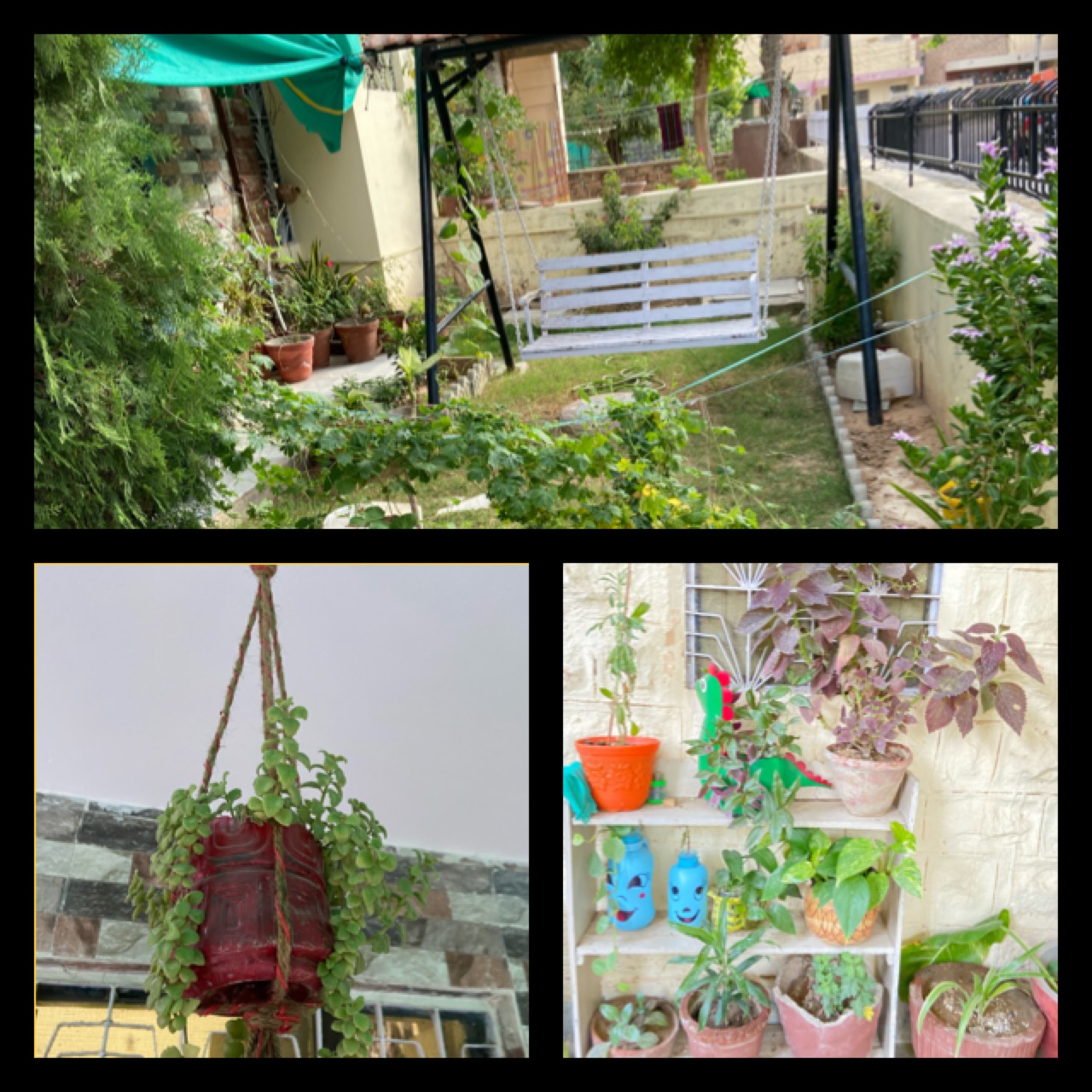 Why throw those plastic and glass bottles when they can be the attraction of your garden. Cut them and paint them or simply hang them in a DIY macrame hanger and Voila !!! You can see that little bunny and fox, they used to be सरसों सों के के ते तेल की बो तल 😅Those reused glass bottles hanging in macrame are unique about my little balcony garden. They glow at night, adding more beauty to it!!