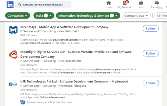 Just make a quick search “software development” and press enter. On the left section, select Companies under the dropdown. And you will get a list of software development companies right there.