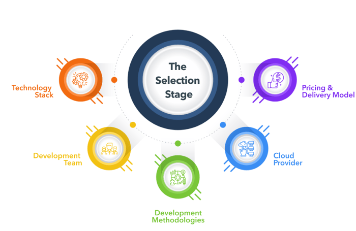 The next phase in your product development lifecycle is to make the crucial choices that will determine the future of your product. These include a lot of things like the development methodology you would follow, the technology frameworks you would use, the team that would build the product, and most importantly, the cloud provider where you would host your product. Here are the different selections you’d have to make: